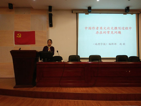 赵歆副主任以《中国作者英文论文攥写过程中存在的常见问题》为题,从科技论文的结构、语法常见的错误、写作注意的问题、投稿前的注意事项等4个方面对地理英文论文的写作进行了详细的讲解。