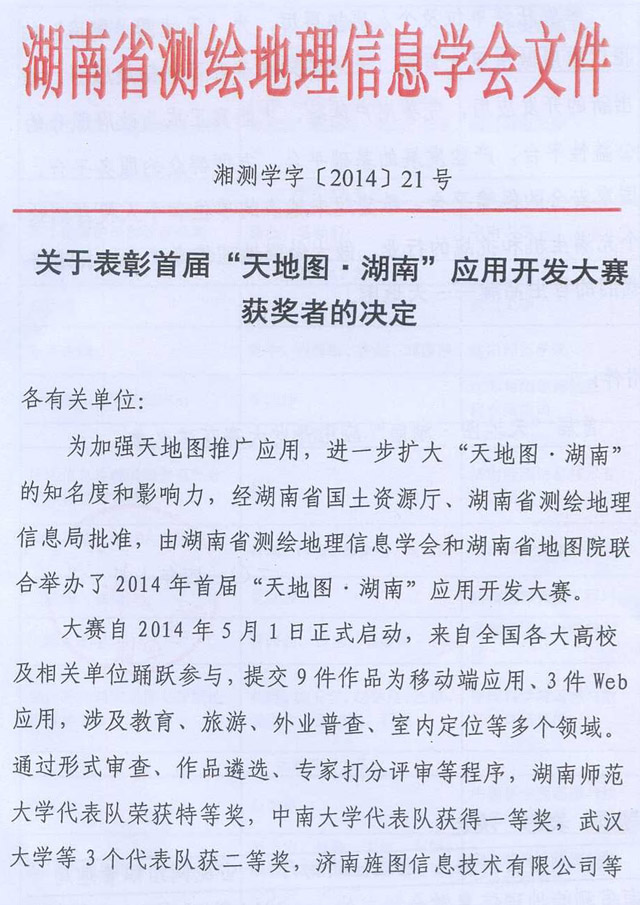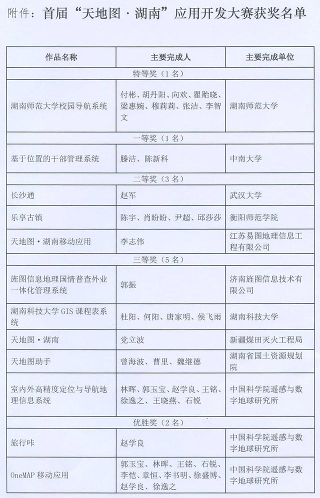国家测绘信息局新闻链接:“天地图·湖南”开发大赛获奖结果揭晓湖师大校园导航系统获特等奖