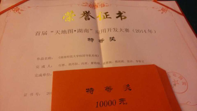 公司2011级本科地信专业付彬等同学积极参加2014年首届“天地图•湖南”应用开发大赛,以参赛作品“mksport体育校园导航系统”力压中南大学、武汉大学、MK体育遥感所等国内著名高校、科研院所及专业公司的作品,荣获赛事唯一的最高荣誉——特等奖!