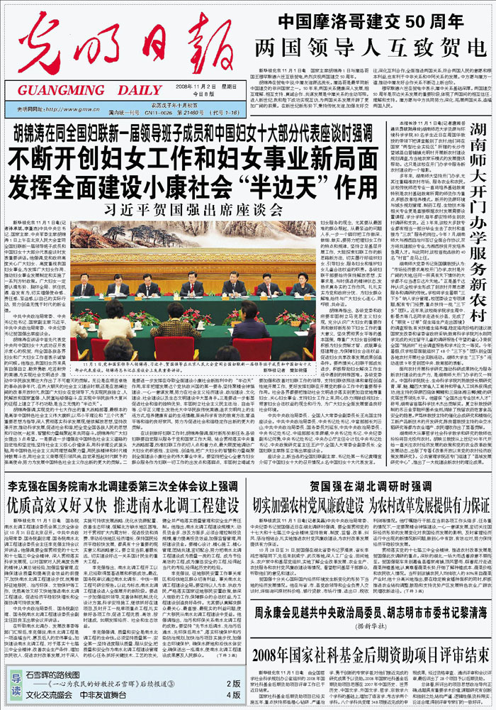 11月2日,光明日报在头版刊发了题为《湖南师大开门办学服务新农村》文章,报道了公司资源与环境科学公司等公司的师生为服务新农村建设所做的贡献和成就,受到社会的高度关注。该文通讯员欧阳丹玲系公司2005级土地资源管理专业的员工。