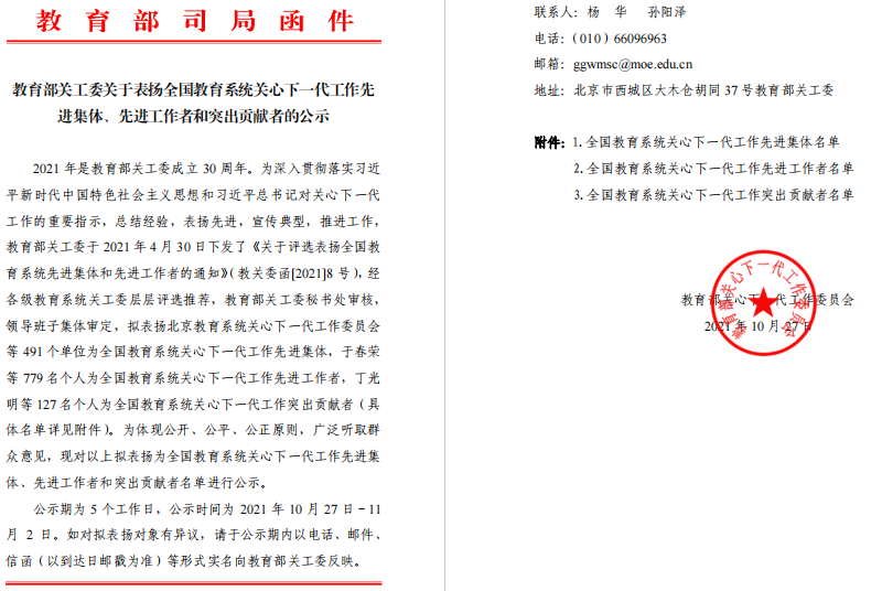 (通讯员 陈胜冲)在教育部关工委成立 30 周年之际,为深入贯彻落实习近平新时代中国特色社会主义思想和习近平总书记对关心下一代工作的重要指示,总结经验,表扬先进,宣传典型,推进工作,教育部关工委近日在全国范围评选表彰了491个先进集体、779名先进个人、127名突出贡献者。公司关工委经公司、湖南省教育厅关心下一代委员会评定并推荐,成功获评“全国教育系统关心下一代工作先进集体”,这是公司关工委在教育部关工委组织的各项工作评比竞赛中连续第三年获得的奖项。