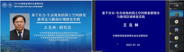 2022年7月24日下午,王克林研究员以“基于社会-生态视角的国土空间修复新理念与脆弱区域修复实践”为题,重点讲授了生态修复理念的发展历程,国土空间生态修复规划的定位,喀斯特区域生态修复理论与实践等内容。