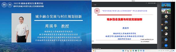 2022年7月26日上午,周国华教授以”城乡融合发展与村庄规划创新“为题,从”新时代国土空间规划该如何创新““乡村发展的未来趋势是什么”“地理学如何发挥更大的作用”三个问题入手,从相关研究文献回顾、城乡融合发展的概念及动力机制、城乡融合对乡村发展的影响分析以及村庄规划创新思路与策略等方面进行讲解。