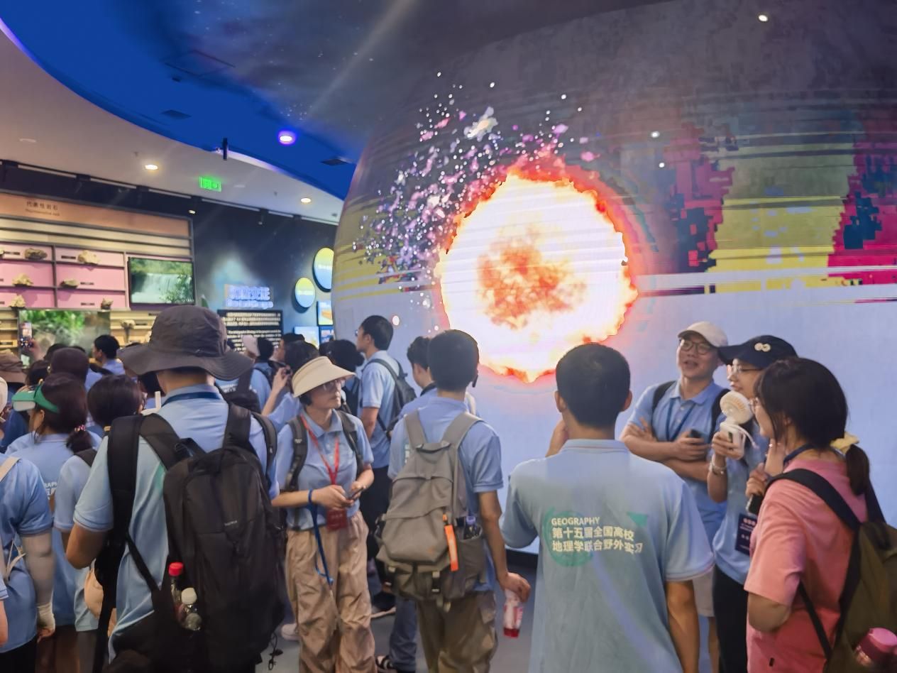 走出金鞭溪来到水绕四门,实习队师生在博物馆工作人员的带领下,按走进张家界、保护张家界、体验张家界的展示顺序,参观了综合展厅、古生物厅、动植物标本厅及历史人物介绍厅。通过张家界地貌5D影院的体验,实习师生对张家界地貌的前世今生和形成演化过程有了更直观、更形象的了解。