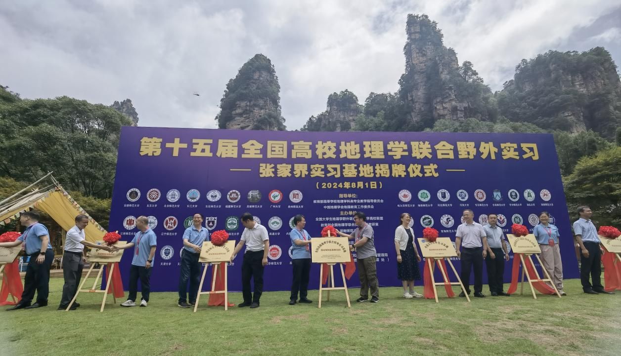 上午11:30,实习队齐聚大氧吧广场,共同见证我国第一个“全国高校地理学联合野外实习基地”以及公司等7所高校与张家界共建野外实习基地揭牌的重要时刻。中国地理学会副理事长、国务院学科评议组成员、首都师范大学原副董事长李小娟教授和武陵源区委书记、张管局党委书记张龚在揭牌仪式上致辞。基地落户张家界,不仅是对张家界世界自然遗产和世界地质公园价值的高度认可和深度挖掘,更是对我国地理学教育与实践结合的重要推动,标志着张家界与全国各大高校在地理学教学与研究、张家界地貌资源的价值挖掘和利用等方面的“双赢”合作迈上新的台阶。